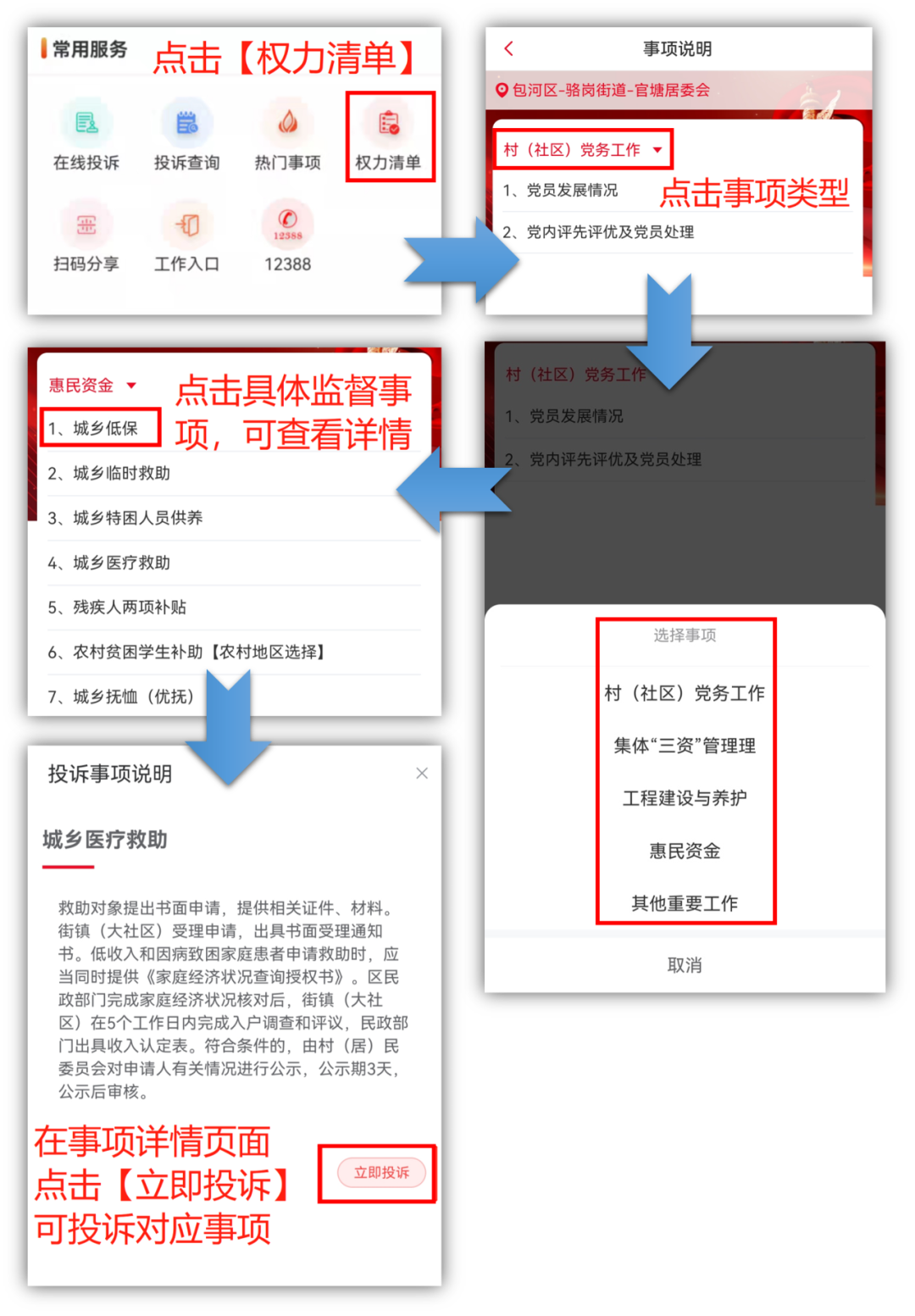 三、 温馨提示 (一)小微权力“监督一点通”服务平台目前暂不受理针对党员干部或监察对象涉嫌违纪违法问题的检举控告问题,如果您想反映此类问题,可点击平台首页的“12388”网络举报网站,向相关纪检监察机关反映。 (二)小微权力“监督一点通”服务平台围绕小微权力清单进行投诉反映,对不属于小微权力清单范围之内的其他问题暂不受理,您可以向“12345”市长热线或其他渠道反映相关问题。 |