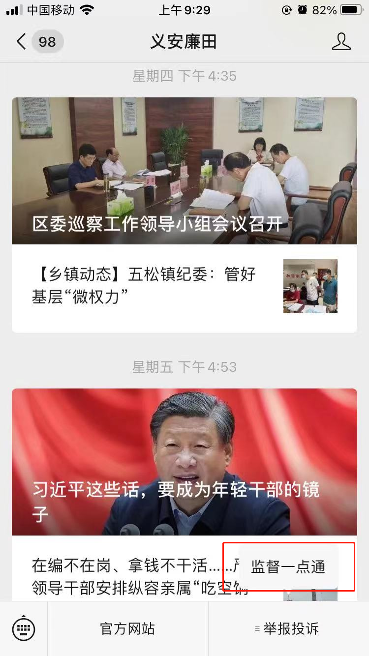 第二步:进入“义安廉田”微信公众号菜单栏,点击“举报投诉”,选择“监督一点通”进入服务平台。